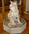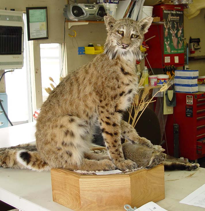 August 6, 2007 Jennifer turned eleven years old on July 31st. The last of her birthday happenings occurred on Saturday, August 3rd. She invited three friends to share in a "scavenger hunt" at our house, a swimming party at neighbor Larry's pool, and a sleepover at her house. It seemed that one of the highlights of the day was the ride from our house to Larry's in the tractor loader bucket. I should have worn my shooting muffs to protect me from further hearing damage via the screams and squeals of four girls! Shevelle, Jennifer, Tess, and Delitra on the ride to the Larry's pool Pool Party! (the screaming did not subside) One can always dream up a good excuse for doing what one is going to do anyway, but our 2002 Buick Park Avenue was racking up a lot of miles! With that in mind, Ann and I visited George Gee Motors in Coeur d'Alene, Idaho on July 13th and came away with a brand new 2007 Cadillac DTS! This thing has bells and whistles that I haven't even discovered yet, but the most important thing: It's RED! (I've heard it said that it's mandatory for old fat guys to drive a Cadillac so we really had no choice.) Here's Little Heifer with MY Cadillac Well, it's been quite a struggle, but I finally got my bobcat back from the taxidermist; the second one. (taxidermist, not bobcat) When I first received the mount it looked very little like a bobcat and I would not display it in our house as it looked then. I described the cat's head as a "grotesque caricature," and that turned out to be the GOOD news! In a previous newsletter I described and pictured the bobcat soon after the kill, with a half grown snowshoe hare, still alive but pinned beneath a front leg of the cat. I had difficulty finding a taxidermist that was willing to mount the rabbit so it could be included in the habitat scenario I wanted. (Apparently taxidermists find rabbits very difficult to work with) A major factor in choosing the original taxidermist to do the work, was that he was the first one I spoke with who was willing to do the rabbit. (Hereinafter, we'll call him Mr. Taxidermist) The second reason; I wanted to get the cat and the rabbit out of my freezer, and the guy could take them right away. (The carcasses were frozen whole because I wanted a full body mount and didn't trust my skills to perform the skinning chore correctly, especially the head and paws) A third consideration; Mr. Taxidermist had done deer shoulder mounts for some friends of ours, and they were pleased with his work. When I delivered the animals to the shop, there was a nearly finished bobcat mount on the wall that looked, to my untrained eyes, pretty much OK. Turned out the guy has also done work for our dentist and his brother, avid hunters both. I took my laptop computer when I delivered the animals and we viewed the pictures taken the day of the kill, to establish a feel for the habitat and help explain what I wanted done with the mount. I later emailed some of the photos for his further review. I requested that the cat be sitting, looking to his right, with the rabbit under one front paw, just as he appeared when I pulled the trigger! Delivery time for the finished work was estimated to be "late summer 2007." All things considered, I felt pretty good about the situation when I handed over the animals on October 2, 2006. My first inkling of potential trouble occurred some weeks later at my next dental appointment. I showed Doc a picture of the cat and told him to whom I had taken it. His comment was, "If it were mine, I'd go get it back!" Further explanation revealed that Doc's brother wasn't at all pleased with the full body mount of his cat! His opinion was that the guy does OK with shoulder mounts and rugs, but may not do so well with a full body mount. In early spring 2007, the hide was back from the tannery, so I arranged a visit for final note comparisons and instructions. After examining the beautifully tanned hide, I inquired about the photos I had emailed. I was told by Mr. Taxidermist that his wife was the only one who could run the computer, he didn't remember seeing the pictures, but was sure they were there. (Warning sign number two) We again went over how the mount was to be configured and even found a bobcat mannequin in one of his catalogs that was posed as I wanted mine. In early June Ann received a call that the mount was completed. Upon returning the call to arrange for pickup, I learned that Mr. Taxidermist was flying out of Spokane on June 14th and would meet me at a nearby motel parking lot to deliver the mount. (This was about 75 miles closer than another trip to his shop.) I nearly had a stroke of apoplexy when I saw it! The head was misshapen, the mount base was too small, the habitat could be called "plaster of paris wheat field" instead of the forest land where the bobcat made his home, and the shape and size were all wrong. (When this tale is finished, I'll show you some "before and after" pictures, and you can draw your own conclusions.) Now, let's turn the clock back to early April 2007. Ann and I are in the parking lot of the Liberty Lake Safeway Store loading groceries in the car when a nice looking pickup drives in and parks nearby. Stenciled on the door was "Captured Expressions Taxidermy," Coeur d'Alene, Idaho. Being the shy fellow I am, I approached the guy and visited a spell. His name is Sean West. We talked about how difficult it was to find someone to do my bobcat the way I wanted and he told me about getting started in the business. He currently works as a mechanic for a local RV dealer, and does taxidermy on the side, but would like to go into his taxidermy full time within the next year or so. I suggested that I would keep him in mind for any future projects we might have and may want to do a story featuring his work for an Outlook Magazine piece sometime in the future. We exchanged business cards, and continued to stay in touch by email. Here's what Sean had to say in an email shortly after our parking 
