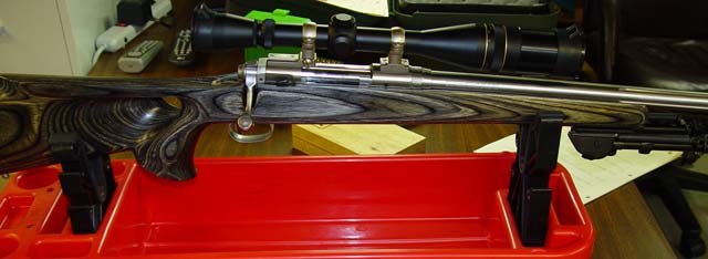 Howdy, again from the Ranch. Today's the last day of April. Hope to get this May newsletter up sometime tomorrow. We've been doin' entirely too much work type stuff, and not enough play type stuff this month! (Listen to me bitch about it! You'd think we weren't retired or somthin'!) Seriously, we had Sunrise Trucking and Contracting put in a basalt rock retaining wall to replace the 28 year old wooden one that was rotting away. Now the landscaping and sod laying that goes with the aftermath of that project is dang near killin' Little Heifer and me! The new wall looks good though. Here's a 'before and after' shot. Old vs New Retaining Walls All work and no shootin' makes me grouchy, Ann says. Did get a chance to play with some of the reloadin' toys last night though. Last month I wrote about our friend's varmint rifle debate, and the fact that he finally settled on the Savage Model 12 BVSS in .223 Remington. I think it was difficult for Courtney to go with the Savage, but he's got it shooting pretty good, and has already installed an aftermarket stock. The original stock was a brown laminate with a very wide beavertail type forearm and large, very pronounced pistol grip. The original has now been replaced by a Boyd's thumbhole ( www.boydsgunstocks.com ) in black and gray laminate. Really looks sharp with the stainless action and barrel of the Savage. This picture is a little 'cluttered' but you'll get the idea. Nice looking Rifle Courtney says the biggest problem was that the stock he wanted is not available with inletting for the heavy barrel on this model. The action inletting only required minor adjustments, but the barrel channel had to be milled out to fit the bull barrel. Fortunately, the guy is an engineer by profession, toolmaker by hobby, and has equipment such as a lathe and milling machine to make this kind of work easier and more accurate. He did a nice job! Since I have a Stoney Point ( www.stoneypoint.com ) overall length gauge, we spent last evening checking and recording overall length for 4 or 5 different bullets he wants to work with in load development for the Savage. The measurements were taken with the bullets just touching the rifling lands. How to do this follows. Green Arrow: Stoney Point Overall Length Gauge with modified case attached. Blue Arrow: Comparator Body containing the .22 caliber Bullet Comparator insert and attached to caliper jaw. Red Arrow: Headspace Gauge insert for Comparator Body. The modified case is just a caliber specific case that is drilled and tapped through the case head, to screw on the end of the gauge. The neck of the case is sized to allow the proper caliber bullet to slip inside and freely move in and out. The gauge has a stem that slips through the center, and is tightened in position with the set screw on the right end. To use, you place a bullet deeply into the case neck with the central stem adjusted so that the bullet doesn't fall down into the case body. Carefully insert the gauge into the chamber until the modified case shoulder (or belt, or rim) is firmly against the headspacing index in the chamber. Then loosen the central stem and push it against the bullet until you feel the bullet contact the rifling lands. Retighten the stem at this point, and withdraw the gauge. You'll probably have to use a cleaning rod to push the bullet out of the barrel, because they usually stick a little and don't come out with the gauge. Place the bullet back in the case neck and measure with the calipers. One caliper jaw holds the comparator body as shown in the picture, and the other goes in a notch in the gauge that lets you index on the case head. The end of the bullet goes in the hole in the bullet comparator. Once the measurement is recorded for reference, loaded rounds with the same bullet can be measured, and seating depth adjusted to seat bullets precisely a specific distance from the lands, to the nearest .001 inch. The next item on the agenda is to do a lot of shootin', to see what specific seating depth gives you the best accuracy for your chosen bullet and load, and then be able to repeat it, exactly. The headspace gauge insert by the red arrow in the picture replaces the bullet comparator insert for measuring headspace. Stoney Point furnishes a chart to determine which of the five inserts is appropriate for the caliber in question. While this tool is called a headspace gauge, what it really does is allow you to accurately measure from the base of the case head to the point the case shoulder indexes on the insert. Of course, for calibers that headspace on the shoulder (.30-06), the measurement is actually headspace, but not for calibers that headspace on the rim (.30-30 Win), or a belt (7mm Rem Mag). So, if these things don't measure actual headspace for all types of cases, what good are they? Well, they can help you get more life out of your brass! Here's how. Full length resizing dies are made to size brass so it will fit in chambers of many brands of firearms, with varying degrees of precision and tolerances. Most die makers instructions call for adjusting a resizing die by screwing it into the press to "touch the top of the shell holder when the ram is up." Remember, that adjustment must allow the sized brass to fit into a chamber at the smallest end of allowed SAAMI specs. This may mean that the shoulder is being pushed back several thousandths farther than it needs to be to fit the chamber in your particular rifle. Then, when that cartridge is fired, and the case shoulder is forced back up into contact with the chamber you have begun a process that, as it is repeated, stretches the case, works the brass excessively, and usually causes premature case head separation! The aforementioned headspace gauge can help you alleviate this problem. Measure a fired case from your rifle, by inserting the case mouth into the proper insert so it indexes on the shoulder, and record the measurement to the base of the cartridge case. Using the same