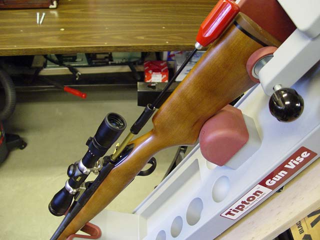 May 1st. Here we are, 15 days into turkey season, and I ain't even heard a turkey, let alone seen any. Opening day found me out, bright and early, setting up those newly purchased decoys, with anticipation at a near critical high. So much for anticipation, although I wasn't all that surprised. As I reported last month, this was my first, ever Spring season turkey hunting effort, and the turkeys really just acted as expected. I know those dang things read the paper regularly, 'else how do they know when to disappear? Just days before the opener, there were 4 gobblers Southeast of the house, that I could have hit with a rock from the shop door! Last year at this time, when I wasn't huntin' 'em, I could stir up a shock gobble, nearly any day, by blowing a coyote howler from the back deck. I could also stand there with a box call, and get answering gobbles, sometimes from 2 or 3 directions. I even left the decoys out for several days where we could watch them from the kitchen windows. Even though I parked the decoys in an area where we have observed turkeys of all ages and both sexes, feeding, dusting, and strutting, I can now find nary a track! I did talk the Little Heifer into taking my picture in my 'full camouflage' turkey huntin' outfit, but heck, my camo was so good you can't even see me in the picture! I'll try to get her to take another picture with me waving so you can see me, and post it in next month's newsletter! I guess I could go hunt someplace else, but my attitude about deer and turkeys, (sometimes called laziness) continues to be: "If it don't poop on our place, I ain't shootin' it!" It's 15 more days before the season closes, so I suppose I could still get lucky and find an incredibly stupid gobbler looking for romance in the front yard, as some have done in the past. Some months ago I unearthed an old Black and Decker Workmate® that hadn't seen much use for a while. It was folded up in the corner of the shop building along with some of my other valuable possessions! (Often referred to by a certain female of the species, as JUNK) I had some projects in mind that could make use of this item, so it was moved to the basement garage in the house. I should also point out the basement garage is no longer a garage, and is now used for Ann's laundry room and my reloading and gunsmithing projects. The Workmate is a Model 400, which is one of those with the double screw clamping feature. The adjustable side of the clamp also unlocks and swivels to an upright position for use as a hold down fixture. (I know I'm screwin' up this description, so here's a picture of the dang thing) Black and Decker Workmate As I utilized some of the features of this contraption on other projects, an idea was born. It began while using the clamping feature to hold my Tipton® Gun Cradle in a solid position for scope mounting or bore cleaning. Even though the cradle has rubber feet, it still wants to slide around on the bench when applying pressure to a cleaning rod. The idea was to somehow use the tilt up feature of the clamping mechanism to position the cleaning cradle at a steep angle, so solvents drain out the muzzle instead of back into the action and/or magazine. I use first class cleaning rod guides made by Stoney Point®, when cleaning bolt action rifles. These guides have a locking collar, secured by a set screw that fits into the bolt handle notch. This allows the chamber insert to be locked tightly into the chamber to minimize solvents leaking back. Still, some of the 'gunk' always seems to run back on me when the cradle is on a level surface. Here is a picture of one of the guides I use. Note the 'solvent window' in the end of the guide. This allows patches or brushes to be aligned with the window when the cleaning rod is inserted, to apply solvent with a minimum of runs and drips. Stoney Point Cleaning Rod Guide My first step was to cut a piece of 1 " by 12 " pine board, slightly longer than the cleaning cradle. Holes were drilled in the board, flange nuts inserted, and fastened in place. This enabled me to bolt the board solidly to the table top, through existing holes, using 5/16th bolts. Next, the Tipton cradle was screwed to the 1 x 12 board, utilizing the existing screw holes for the cradle legs. When it all goes together, it looks like this: Cleaning Cradle Horizontal By sliding out the wide part of the table top, and releasing the tilt locks, the end of the cradle can be tilted down to rest solidly against the cross brace: (Note the coffee can used to catch drips and soiled patches) Cleaning Cradle Tilted In this position, there is no way that solvent, dirt, or other undesirables can run back into action or magazine! A word of caution here: Don't do this with a cleaning cradle that lacks a positive clamping mechanism to hold the rifle. A rifle and scope meeting a concrete floor from table top height, often results in less than desirable consequences! This is a closer view, with a J. Dewey® cleaning rod inserted and ready to go. Tilted Cradle With Cleaning Rod and Rod Guide I'd like to tell you that having this new arrangement has made gun cleaning a really enjoyable chore, but that would be a lie. Cleaning guns still has to be one of the most hated jobs on the planet! But, one does what one has to do! If you want to try a project such as this, and could use further information, just send me an email and I'll try to help out. As with many of my projects, this one was a lot easier to do than describe! As soon as this newsletter is finished tonight, my next chore is to sort out some brass to reload for Ann's 7mm-08. This rifle, as I have described before, is a 'youth size' Remington Model 7, with a 20 inch barrel. (This is the rifle pictured in the previous cleaning cradle story) This little Remington just hasn't shot the kind of groups I like to see from the bench. I guess you could still call it a 'minute of whitetail' shooter though, since Ann has made one shot kills with it, in each 